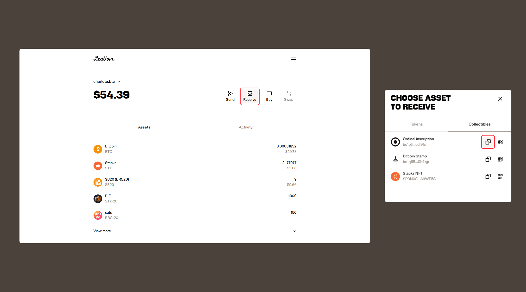 Leather users can receive Ordinals from other users or Leather accounts using their Taproot address (which starts with “bc1p”). Address type aside, the process of receiving Ordinals is similar to that of receiving tokens and other collectibles.